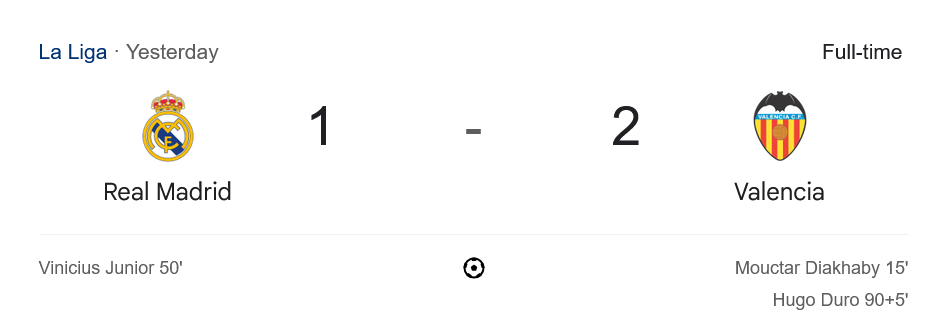 การแข่งขันฟุตบอล ลาลิกา 2025 ระหว่าง เรอัล มาดริด และ บาเลนเซีย ที่สนามซานติอาโก้ เบร์นาเบว ได้จบลงด้วยความพ่ายแพ้ของเจ้าบ้าน เรอัล มาดริด ไปด้วยสกอร์ 1-2 สร้างความประหลาดใจให้กับแฟนบอลอย่างมาก การแข่งขันที่เข้มข้นนี้ถือเป็นอีกหนึ่งแมตช์ที่โดดเด่นใน บ้านผลบอล ของค่ำคืนนี้