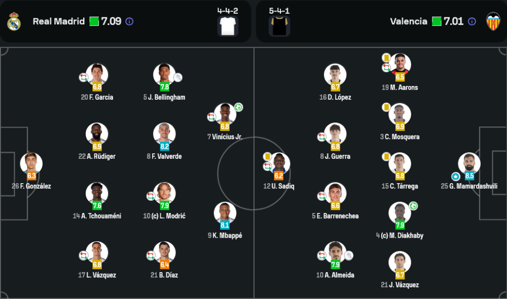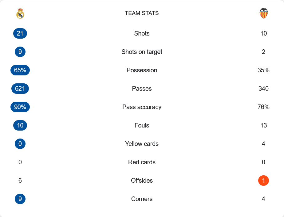 เรอัล มาดริด ใช้แผนการเล่น 4-4-2 เน้นเกมรุกจากสองปีกที่มีความเร็วอย่าง วินิซิอุส จูเนียร์ และ เอ็มบัปเป้ การเคลื่อนที่ของ เบลลิงแฮม และ บัลเบร์เด้ ทำให้เกมรุกของพวกเขาอันตรายอย่างมาก โดยเฉพาะช่วงครึ่งหลังที่พวกเขาสามารถบุกใส่ บาเลนเซีย ได้อย่างต่อเนื่อง แต่กลับต้องผิดหวังเพราะการทำงานที่เหนียวแน่นของเกมรับทีมเยือน