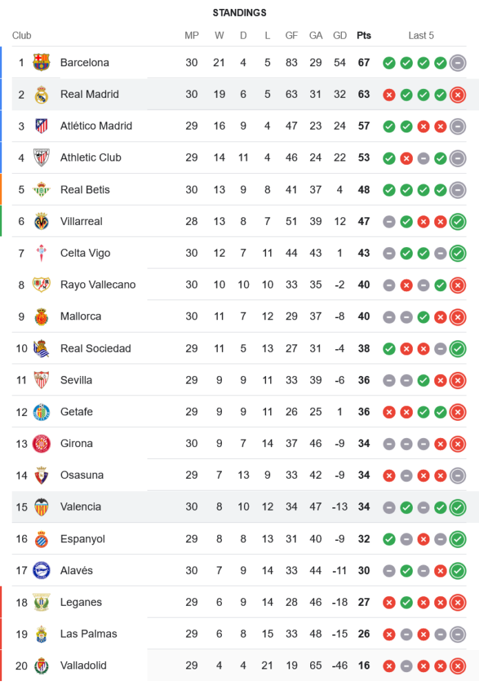 จากผลการแข่งขันนี้ทำให้ เรอัล มาดริด ยังคงอยู่ในอันดับที่สองของตาราง มี 63 คะแนน จาก 30 นัด ขณะที่ บาเลนเซีย เก็บสามแต้มเพิ่มขึ้นมาเป็น 34 คะแนน อยู่อันดับที่ 15 หนีโซนตกชั้นออกไปได้ชั่วคราว