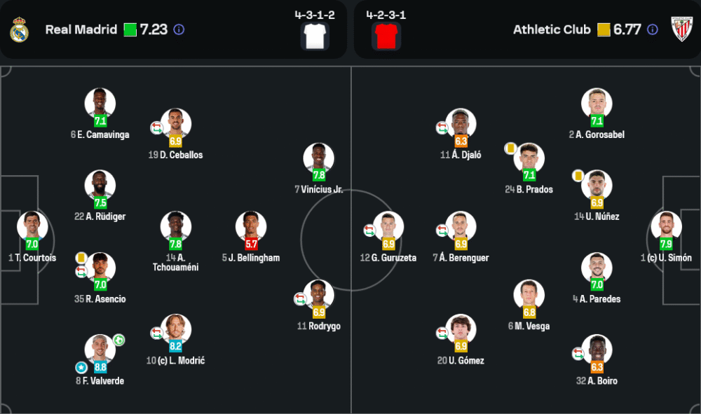 เฟเดริโก้ วัลเวร์เด คือฮีโร่ตัวจริงของเรอัล มาดริดในเกมนี้ ด้วยผลงานระดับมาสเตอร์คลาสทั้งการขึ้นเกม การสอดแทรกยิงประตู รวมถึงการเคลื่อนที่ที่ชาญฉลาด และที่สำคัญคือซัดประตูชัยสุดล้ำค่าในนาทีที่ 90+3 รับคะแนนเรตติ้งสูงสุดของเกม 8.8