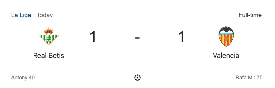 เกมส่งท้ายลาลีกานัดที่ 38 ระหว่าง เรอัล เบติส เปิดบ้านรับมือ บาเลนเซีย จบลงด้วยผลเสมอ 1-1 ในแมตช์ที่เต็มไปด้วยจังหวะเร้าใจและแท็กติกที่สูสีกันตลอด 90 นาที โดยทางบ้านกีฬาเกาะติด ผลบอลสด จากทุกช่วงสำคัญ และขอบอกเลยว่าเกมนี้มีทุกอารมณ์ ทั้งความเฉียบคม ความผิดพลาด และจังหวะดราม่าช่วงท้ายเกมที่ทำเอาแฟนบอลลุ้นจนนั่งไม่ติด