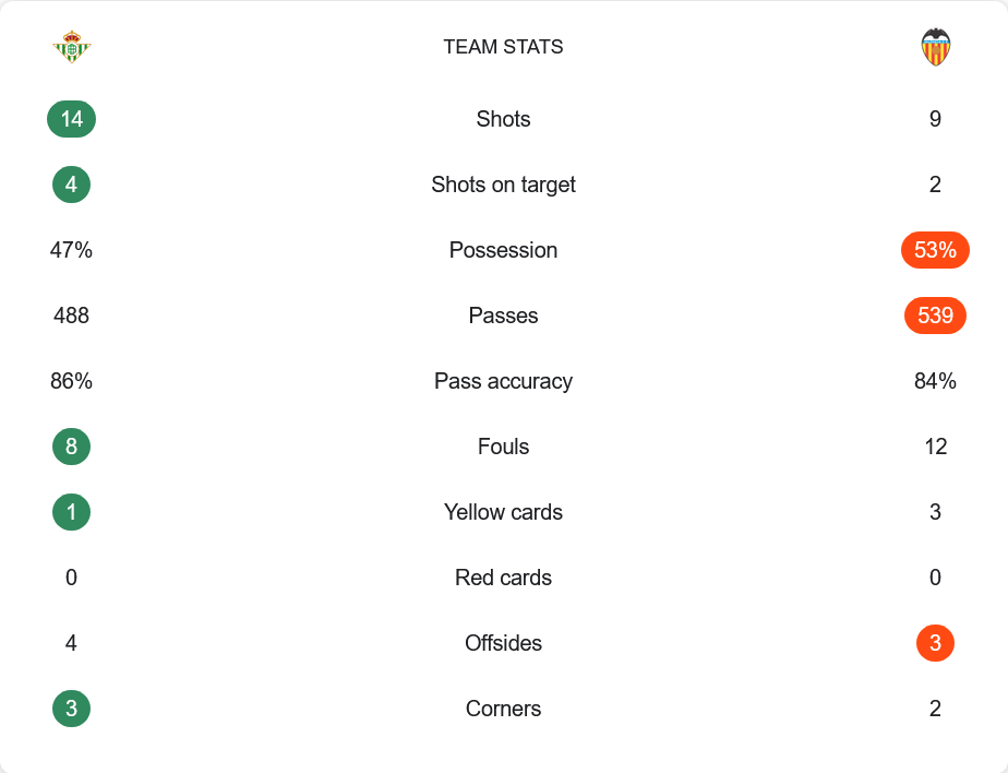 ตลอด 90 นาที บาเลนเซียเป็นฝ่ายครองบอลได้มากกว่าที่ 53% เทียบกับ 47% ของเบติส และมีจำนวนการผ่านบอลถึง 539 ครั้ง ขณะที่เจ้าบ้านผ่านบอล 488 ครั้ง แต่แม่นยำกว่าที่ 86% ต่อ 84% ด้านโอกาสยิง เบติสมี 14 ครั้ง เข้ากรอบ 4 ส่วนบาเลนเซียยิง 9 ครั้ง เข้ากรอบเพียง 2 ลูก แม้การครองบอลจะได้เปรียบแต่ประสิทธิภาพในการจบสกอร์ของทีมเยือนยังเป็นรอง เบติสได้ลูกเตะมุม 3 ครั้ง ขณะที่บาเลนเซียได้ 2 ครั้ง และมีใบเหลืองรวมกันถึง 4 ใบ โดยบาเลนเซียโดนไปถึง 3 ใบในเกมนี้