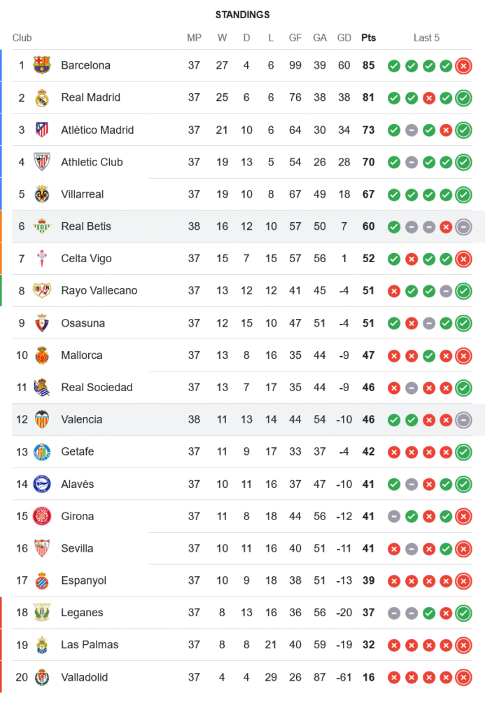 ผลเสมอในเกมนี้ส่งผลให้ เรอัล เบติส เก็บเพิ่มเป็น 60 คะแนนจาก 38 นัด ยึดอันดับ 6 ของตาราง และคว้าตั๋วไปเล่นยูฟ่ายูโรปาคอนเฟอเรนซ์ลีกเรียบร้อยแล้ว ส่วนทาง บาเลนเซีย จบฤดูกาลในอันดับ 12 มี 46 แต้ม ไม่ดีไม่แย่ อยู่กลางตารางแบบสบายใจแม้ฟอร์มช่วงท้ายจะสะดุดพอสมควร