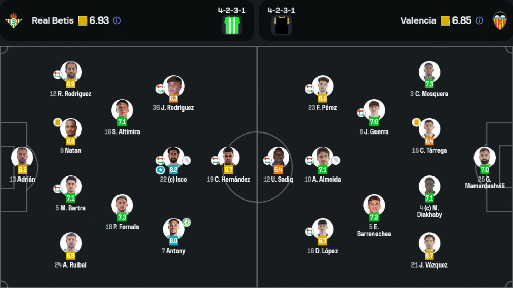 - ตัวรุก: อองโตนี่ (8.0), อิสโก้ (8.2), ฆวน โรดริเกซ (6.3)