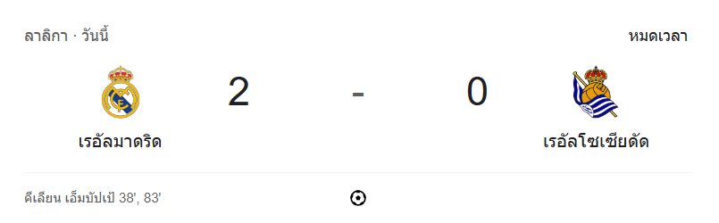- นาทีที่ 92: จบเกม เรอัล มาดริด เปิดบ้านชนะ เรอัล โซเซียดัด 2-0