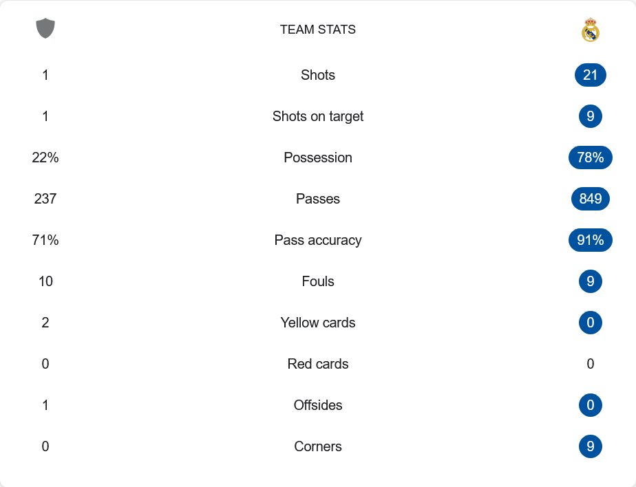 เรอัล มาดริด เหนือกว่าอย่างชัดเจนทั้งการครองบอล 78% ต่อ 22% ผ่านบอลมากถึง 849 ครั้งแม่นยำ 91% เทียบกับเจ้าบ้านที่ทำได้ 237 ครั้งแม่นยำ 71% สร้างโอกาสยิงถึง 21 ครั้ง ตรงกรอบ 9 ครั้ง และได้ลูกเตะมุม 9 ครั้งเต็ม ขณะที่ WSG Tirol ยิงเพียง 1 ครั้งตรงกรอบเดียวตลอดทั้งเกม