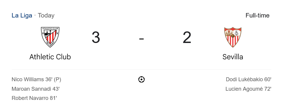 แม้รูปเกมในช่วงต้นจะดูเป็นของเซบีย่า ที่ครองบอลได้เหนือกว่าชัดเจน แต่ “ผลบอลสด” บอกตรงกันว่า บิลเบาใช้เกมสวนกลับอย่างมีประสิทธิภาพ นาที 36 นิโก วิลเลียมส์ ซัดจุดโทษเข้าไปไม่พลาด ส่งเจ้าถิ่นนำก่อน 1-0 จากนั้นนาที 43 มารวน ซานนาดี เติมเกมยิงเข้าไปอย่างเฉียบขาด จบครึ่งแรก “บ้านผลบอล” รายงานว่า บิลเบานำ 2-0 อย่างเหนือความคาดหมาย!