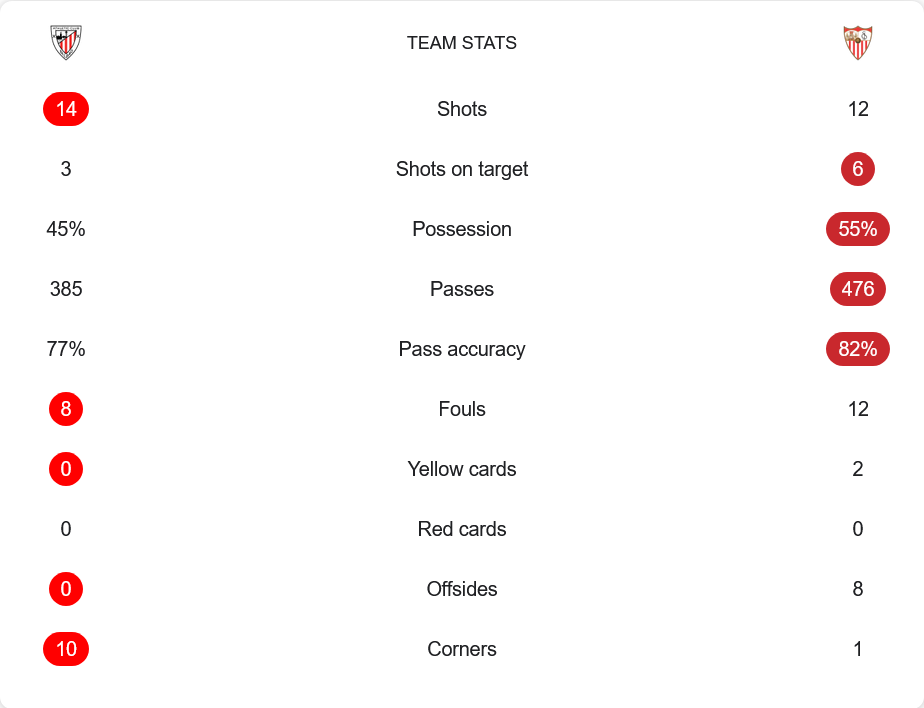 แม้เซบีย่าจะครองบอลมากถึง 55% และผ่านบอลมากกว่าด้วยจำนวน 476 ครั้ง เทียบกับบิลเบาเพียง 385 ครั้ง แต่ “ผลบอลสด” จากสนามระบุว่าการครองบอลของทีมเยือนนั้นไร้พิษสง บิลเบาแม้ยิงเข้ากรอบแค่ 3 ครั้ง แต่กลับกลายเป็นประตูทั้งหมด 3 ลูก ขณะที่เซบีย่ายิงตรงกรอบถึง 6 ครั้งแต่ยังไม่เพียงพอ การเล่นลูกนิ่งของเจ้าถิ่นยังแสดงให้เห็นถึงความเฉียบคม เมื่อได้ถึง 10 ลูกเตะมุม เทียบกับของเซบีย่าแค่ 1