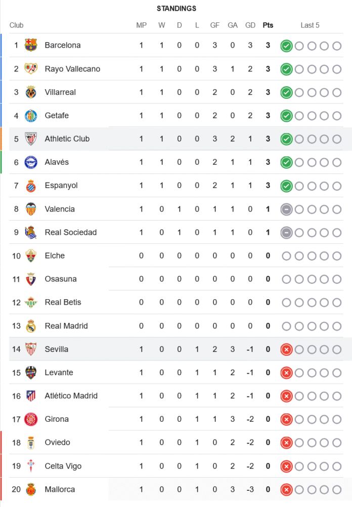 ชัยชนะในเกมนี้ส่งผลให้ แอธเลติก บิลเบา ขยับขึ้นรั้งอันดับ 5 ของตารางลาลิกา ด้วย 3 คะแนนเต็มและลูกได้เสีย +1 จาก “บ้านผลบอล” ส่วนเซบีย่าหล่นไปอยู่อันดับ 14 ยังไม่มีแต้มหลังนัดแรก เสียถึง 3 ประตู ถือเป็นการเปิดหัวที่น่าผิดหวัง