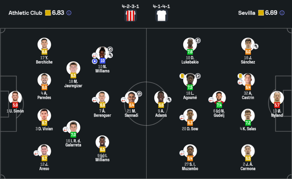 นิโก วิลเลียมส์ ปีกตัวจี๊ดของบิลเบา โชว์ฟอร์มระดับเวิลด์คลาส คว้ารางวัล “Player of the Match” ไปครองด้วยคะแนนเต็ม 10 จากการยิงจุดโทษอย่างเฉียบขาด และมีส่วนร่วมกับเกมบุกแทบตลอดทั้ง 90 นาที ความเร็วและการลากเลื้อยของเขาสร้างปัญหาให้แนวรับเซบีย่าอย่างหนัก