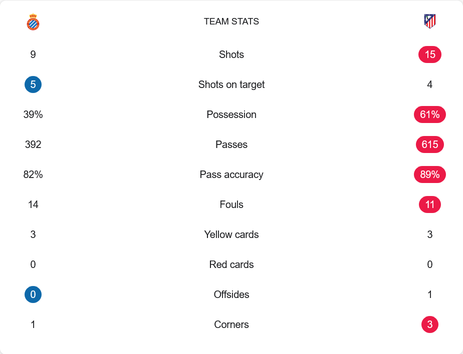 แม้แอต.มาดริดจะเป็นฝ่ายครองบอลได้มากถึง 61% และจ่ายบอลมากถึง 615 ครั้งเทียบกับเอสปันญ่อลที่มีแค่ 392 ครั้ง แต่กลับมีโอกาสยิงตรงกรอบเพียง 4 ครั้งจากทั้งหมด 15 ครั้ง ขณะที่เอสปันญ่อลแม้จะยิงเพียง 9 ครั้ง แต่ตรงกรอบถึง 5 และได้สองประตูจากนั้น