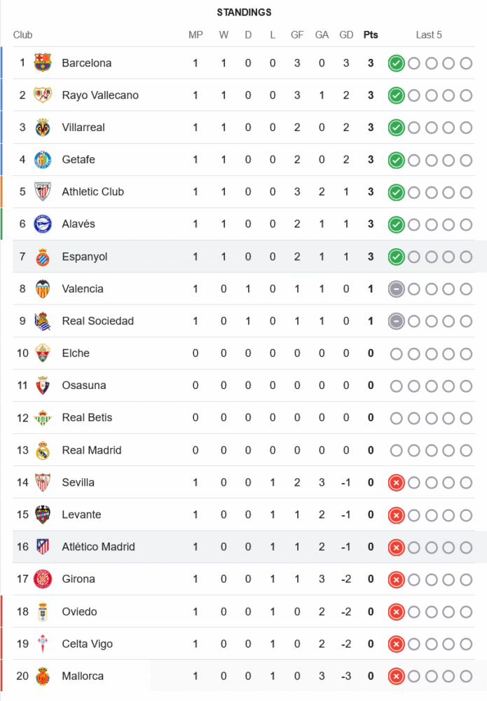 ชัยชนะนัดนี้ส่งเอสปันญ่อลขึ้นไปรั้งอันดับ 7 ของตาราง มี 3 แต้มเต็มจากเกมแรก ขณะที่แอต.มาดริด หล่นไปอยู่อันดับ 16 แบบเจ็บแสบ จากที่เคยถูกยกให้เป็นหนึ่งในทีมลุ้นแชมป์ กลับออกสตาร์ตด้วยความพ่ายแพ้