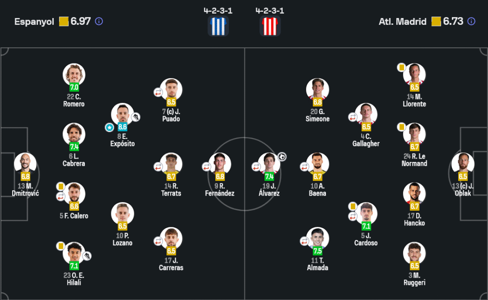 โคเก้ (6.6), บาร์ริออส (6.8), ราสปาโดรี่ (6.5), กรีซมันน์ (6.3), เซอร์ลอธ (6.5)