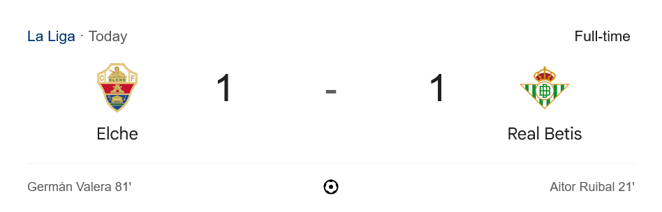 ที่เอสตาดิโอ มาร์ติเนซ บาเลโร่ แฟนบอลได้ชมเกมเข้มข้นสมราคา ผลบอลสด ลาลีกาสัปดาห์แรก เอลเช่ เปิดบ้านต้อนรับ เรอัล เบติส ที่มากับความมั่นใจ เกมนี้เจ้าถิ่นครองบอลเหนือกว่าเกือบทั้งเกม แต่เบติสใช้จังหวะคมและเร็วออกนำไปก่อนจาก ไอตอร์ รุยบัล นาที 21 ก่อนที่ท้ายเกมนาที 81 เอร์มาน บาเลรา จะซัดตีเสมอให้เอลเช่ไล่เจ๊า 1-1 แบ่งแต้มไปอย่างดุเดือด