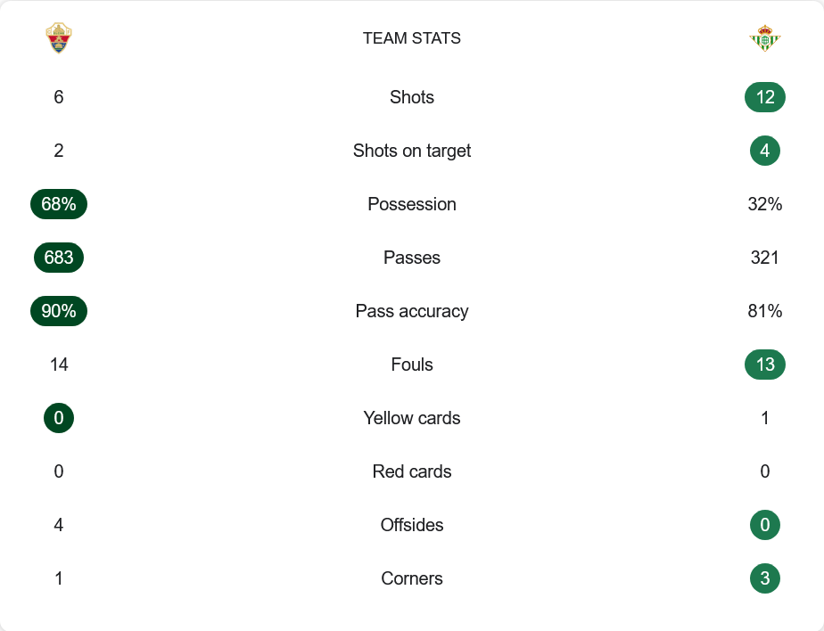 เกมนี้สะท้อนชัดถึงสไตล์แตกต่าง เอลเช่ครองบอล 68% จ่ายบอล 683 ครั้ง ความแม่นยำสูงถึง 90% ยิง 6 ครั้ง เข้ากรอบ 2 ส่วน เบติสครองบอลเพียง 32% จ่ายบอล 321 ครั้ง แม่นยำ 81% แต่ยิงมากกว่าถึง 12 ครั้ง เข้ากรอบ 4 ฟาวล์รวม 27 ครั้ง เกมดุเดือดและสูสี เตะมุมเอลเช่ได้แค่ 1 ส่วนเบติสได้ถึง 3