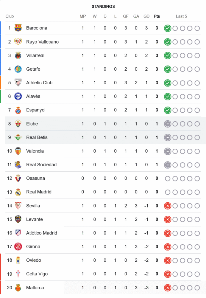 หลังจบเกมนี้ เอลเช่และเบติสมีแต้มเท่ากันที่ 1 คะแนน อยู่กลางตาราง โดยเอลเช่อันดับ 8 ส่วนเบติสอันดับ 9 การออกสตาร์ทแบบแบ่งแต้มทำให้ยังต้องลุ้นอีกยาวสำหรับทั้งสองทีมในการเบียดพื้นที่หัวตาราง
