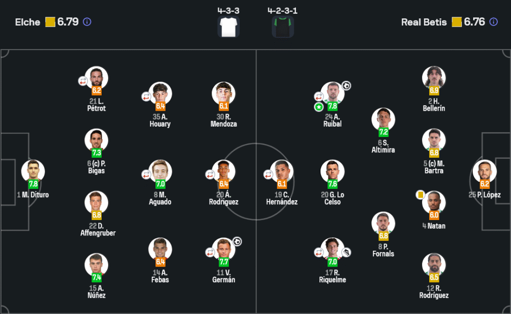 ไอตอร์ รุยบัล คือพระเอกของเกม ยิงเปิดสกอร์ให้เบติสและป่วนเกมรับเอลเช่ตลอดเวลา เรตติ้ง 7.8 สร้างโอกาสสำคัญหลายครั้ง แม้ทีมจะโดนตีเสมอ แต่ฟอร์มส่วนตัวถือว่าโดดเด่นที่สุดในสนาม