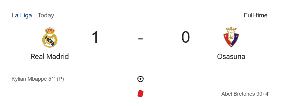เข้าสู่ครึ่งหลัง มาดริดบุกต่อเนื่องและมาได้ประตูขึ้นนำ 1-0 ในนาที 51 จากจังหวะที่เอ็มบัปเป้ซัดจุดโทษเข้าไปอย่างเด็ดขาด หลังจากนั้นโอซาซูน่าพยายามเปิดเกมรุกสวนกลับ แต่ไม่สามารถสร้างโอกาสเข้ากรอบได้เลย และมาเสียเปรียบหนักช่วงท้ายเกมนาที 90+4 เมื่อ อาเบล เบรโตเนส โดนใบแดงจากการเล่นนอกเกม ส่งผลให้ทีมเหลือ 10 คน จบเกมราชันชุดขาวประเดิมซีซั่นด้วยสามแต้มล้ำค่า