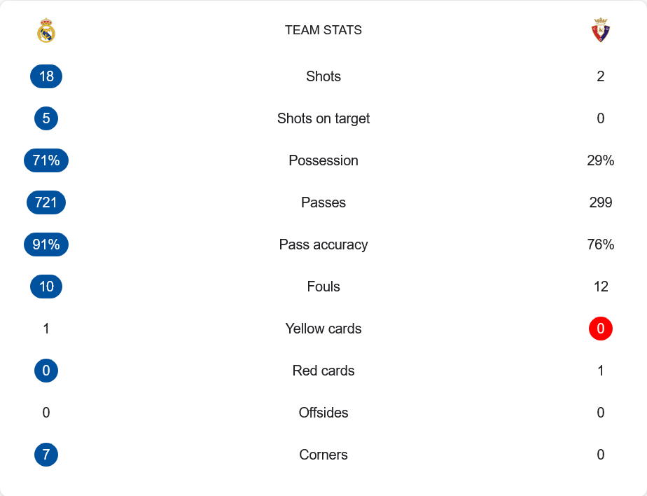 เรอัล มาดริดครองเกมแทบทั้งสนามด้วยการครองบอล 71% เทียบกับโอซาซูน่าเพียง 29% จ่ายบอลมากกว่าเท่าตัว 721 ต่อ 299 ครั้ง ความแม่นยำสูงถึง 91% ส่วนโอซาซูน่าอยู่ที่ 76% มาดริดมีโอกาสยิงถึง 18 ครั้ง เข้ากรอบ 5 ครั้ง ขณะที่โอซาซูน่ายิงเพียง 2 ครั้งและไม่เข้ากรอบเลย แม้ฟาวล์ของทั้งสองทีมจะใกล้เคียงกัน แต่โอซาซูน่ามีใบแดงท้ายเกมที่ทำให้สถานการณ์ยากขึ้น