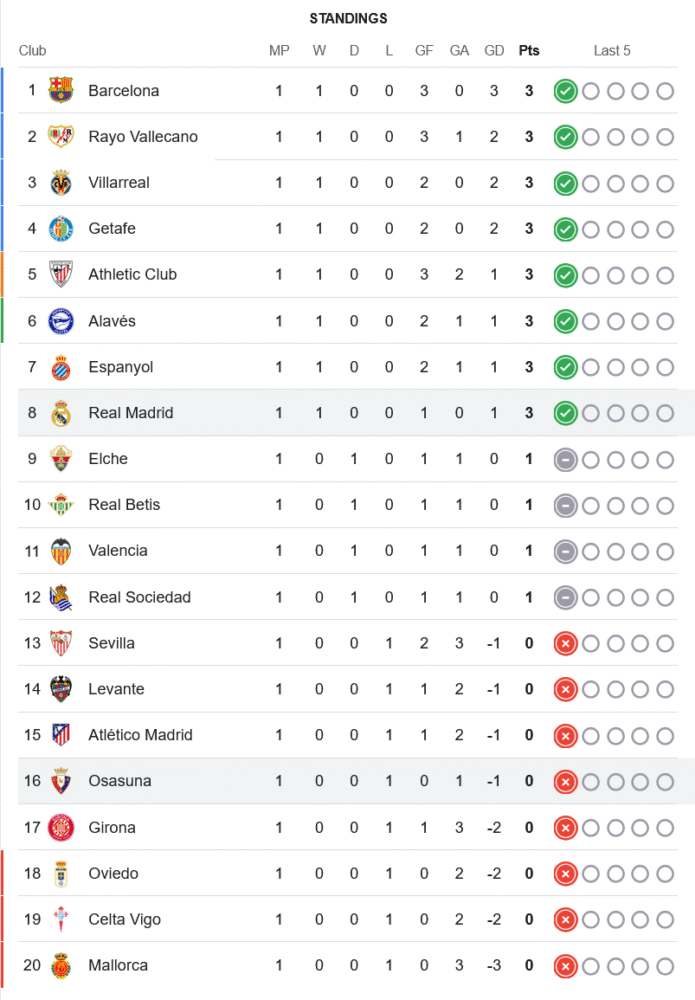 ชัยชนะเกมนี้ทำให้เรอัล มาดริดเก็บ 3 คะแนนเต็ม ประเดิมซีซั่นด้วยการขึ้นมาอยู่อันดับ 8 ของตาราง มีแต้มเท่าบาร์ซ่าและบิ๊กทีมหลายทีมที่ชนะเกมแรกเช่นกัน ส่วนโอซาซูน่าออกสตาร์ทอย่างน่าผิดหวัง แพ้ตั้งแต่นัดเปิดสนาม รั้งอันดับ 16 แบบไม่มีแต้ม