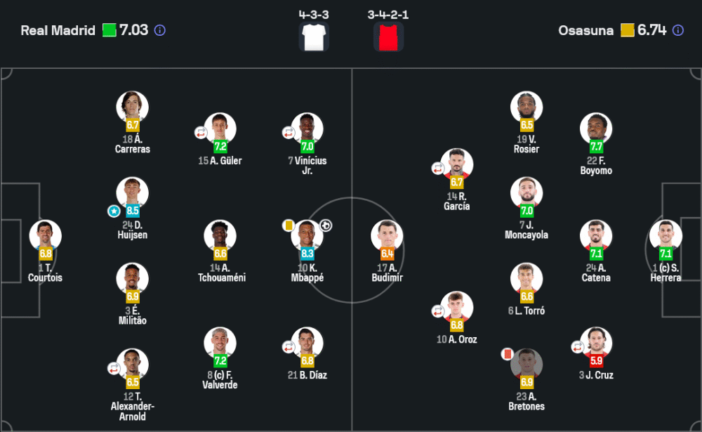 ดีน ฮุยส์เซน กองหลังดาวรุ่งของเรอัล มาดริด โชว์ฟอร์มสุดแกร่ง เก็บกวาดบอลกลางอากาศและอ่านจังหวะเกมได้ยอดเยี่ยม ได้คะแนนสูงถึง 8.5 ถือเป็นกำแพงเหล็กที่ทำให้โอซาซูน่าแทบไม่มีโอกาสลุ้นประตู