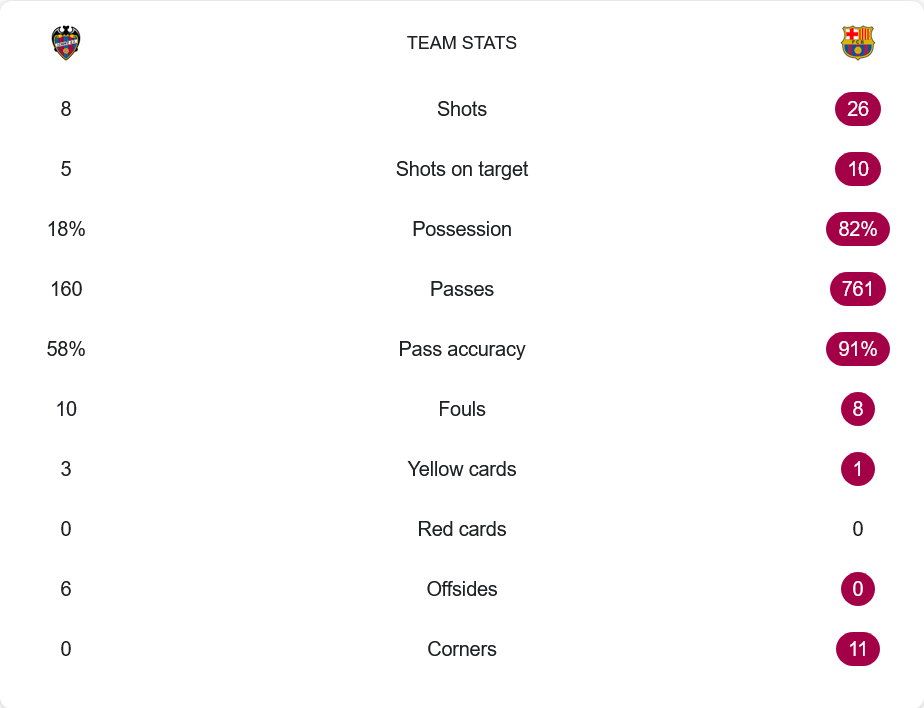 ตัวเลขสะท้อนเกมนี้อย่างชัดเจน บาร์ซ่าครองบอล 82% ต่อ 18% ของเลบานเต้ และสร้างโอกาสยิงได้ถึง 26 ครั้ง เข้ากรอบ 10 ครั้ง ต่างจากเลบานเต้ที่มีเพียง 8 ครั้ง แต่ยังคงคมในจังหวะสวนกลับ การผ่านบอลของบาร์ซ่าก็เหนือกว่า 761 ต่อ 160 ครั้ง และมีความแม่นยำถึง 91% ขณะที่เลบานเต้แม่นยำแค่ 58% สิ่งนี้ตอกย้ำว่าบาร์เซโลน่าคือทีมที่ครองเกมเหนือกว่าอย่างสิ้นเชิง