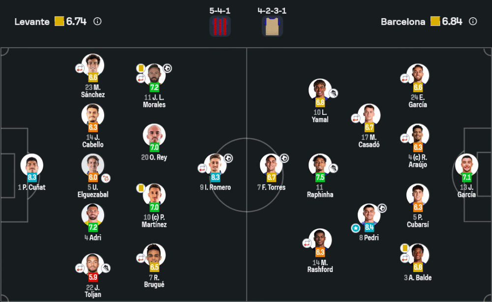 ผู้เล่นตัวจริง: โจน การ์เซีย, อเราโฆ, กูบาร์ซี่, การ์เซีย, บัลเด้, คาซาโด, เปดรี, ราฟินญ่า, ยามาล, แรชฟอร์ด, ตอร์เรส