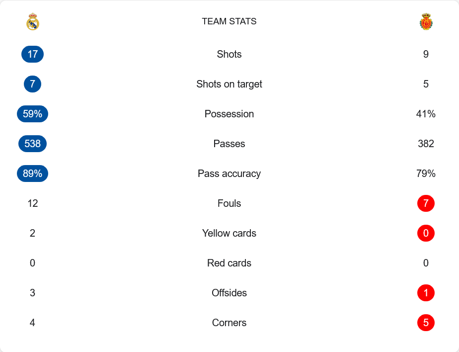 มาดริดครองบอลมากกว่าราว 59% ผ่านบอลประมาณ 538 ครั้ง ความแม่นยำใกล้ 89% ยิงทั้งหมด 17 เข้ากรอบ 7 ส่วนมายอร์ก้าถือบอล 41% จ่ายราว 382 ครั้ง แม่นยำ 79% สร้างโอกาส 9 ครั้ง เข้ากรอบ 5 เกมค่อนข้างดุเดือด ฟาวล์เจ้าบ้าน 12 ทีมเยือน 7 เตะมุมใกล้เคียงกัน ราชัน 4 มายอร์ก้า 5—สะท้อนเกมบุกแลกที่เปิดกว้างแต่จบกันไม่ลงในครึ่งหลัง