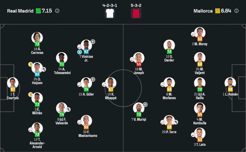 การเปลี่ยนตัวสำคัญ: 66’ บราฮิม ดิอาซ ↔ บัลเบร์เด้, 72’ การ์บาฆาล ↔ อเล็กซานเดอร์-อาร์โนลด์, 72’ โรดริโก ↔ วินิซิอุส, 72’ เซบายอส ↔ กือเลอร์, 90’ กอนซาโล การ์เซีย ↔ เอ็มบัปเป้