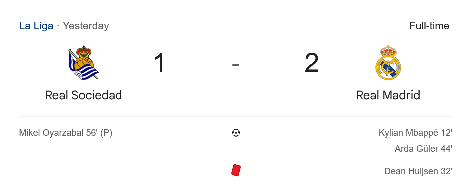 บ้านกีฬา พามาเก็บตกศึก ลาลีกา สเปน นัดมันส์เมื่อคืนที่ผ่านมา เรอัล มาดริด บุกเยือน เรอัล โซเซียดาด และยังคงโชว์ความโหดต่อเนื่อง บุกเฉือนชนะไปด้วยสกอร์ 2-1 จากสองประตูสำคัญของ คีเลียน เอ็มบัปเป้ นาที 12 และ อาร์ด้า กูลาร์ นาที 44 แม้จะเหลือผู้เล่นเพียง 10 คนตั้งแต่นาที 32 หลัง ดีน ฮุยเซน โดนใบแดงไล่ออก แต่สุดท้ายยังเอาตัวรอดเก็บสามแต้มเต็มได้ ขณะที่เจ้าถิ่นไล่ตีไข่แตกจากลูกจุดโทษของ มิเกล โอยาร์ซาบาล นาที 56 แต่ไม่เพียงพอ