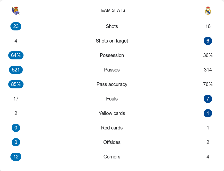 แม้โซเซียดาดจะครองบอลเหนือกว่า ยิงมากกว่า (23 ต่อ 16) และได้ลูกเตะมุมมากกว่า (12 ต่อ 4) แต่ประสิทธิภาพในการจบสกอร์ยังน้อยเกินไป ต่างจากมาดริดที่แม่นยำ ยิงตรงกรอบ 6 ครั้งเป็น 2 ประตู การฟาวล์ของเจ้าถิ่นสูงถึง 17 ครั้ง เทียบกับราชันที่ทำเพียง 7 ครั้ง