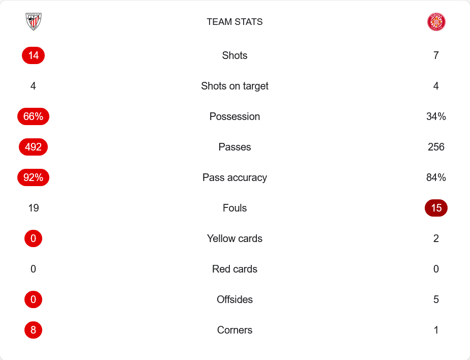 ตัวเลขชัดเจนว่าบิลเบาครองเกมเหนือกว่า ครองบอลถึง 66% ต่อ 34% สร้างโอกาสยิง 14 ครั้ง เข้ากรอบ 4 ครั้ง ขณะที่คิโรน่ามีโอกาส 7 ครั้ง แต่เข้ากรอบเท่ากันคือ 4 ครั้ง การผ่านบอล บิลเบาทำได้ 492 ครั้ง ความแม่นยำสูงถึง 92% ส่วนคิโรน่า 256 ครั้ง ความแม่นยำ 84% เกมนี้ยังมีจังหวะฟาวล์มากถึง 34 ครั้งรวมกัน แสดงให้เห็นถึงความเข้มข้นและการปะทะดุเดือดของทั้งสองทีม