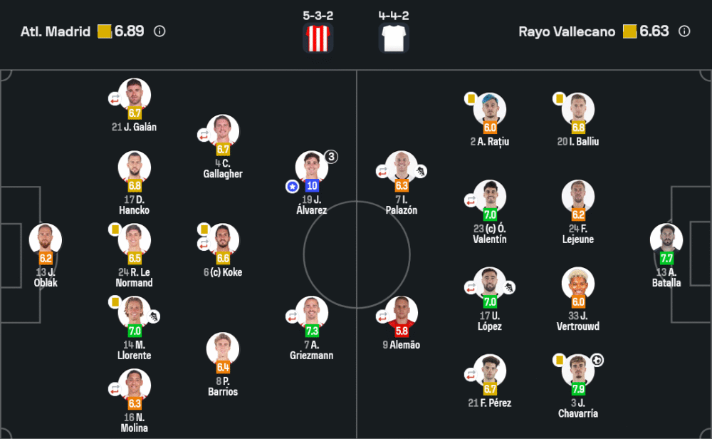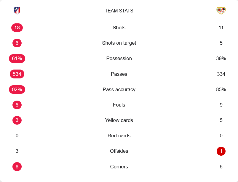 แอตเลติโก้ครองบอล 61% ต่อ 39% ผ่านบอลมากถึง 534 ครั้ง ความแม่นยำสูงถึง 92% เทียบกับราโย่ที่ทำได้ 334 ครั้งและแม่นยำ 85% การสร้างโอกาสเจ้าถิ่นเหนือกว่าชัดเจน ยิง 18 ครั้ง เข้ากรอบ 6 ส่วนทีมเยือนยิง 11 ครั้ง เข้ากรอบ 5 ฟาวล์รวมกัน 15 ครั้ง เกมนี้เดือดจนมีใบเหลืองถึง 8 ใบ (เจ้าบ้าน 3, ทีมเยือน 5) ลูกเตะมุม แอตเลติโก้ได้ 8 ต่อ 6 ของราโย่
