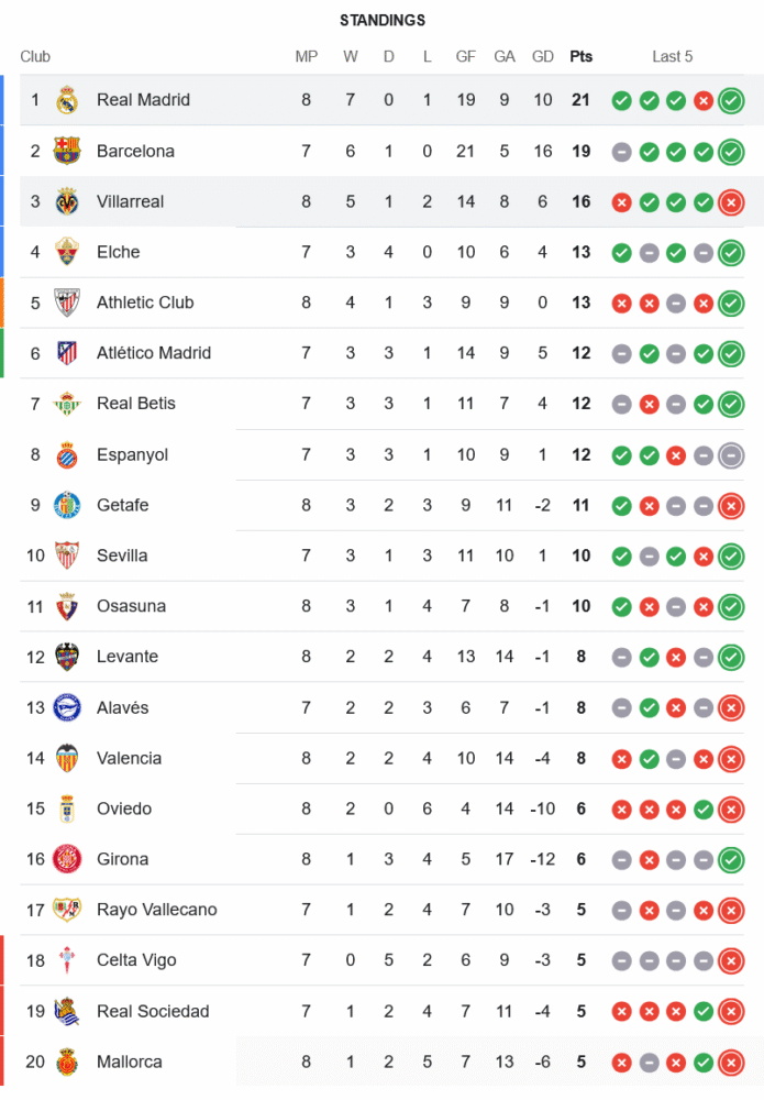 ชัยชนะนัดนี้ส่ง เรอัล มาดริด ขึ้นรั้งจ่าฝูง ลาลิกา มี 21 คะแนน จาก 8 นัด นำ บาร์เซโลนา ที่มี 19 คะแนน ส่วน บียาร์เรอัล หล่นมาที่อันดับ 3 มี 16 คะแนน แต่ยังอยู่ในเส้นทางลุ้นพื้นที่ยุโรปตาม ตารางบอล ล่าสุด