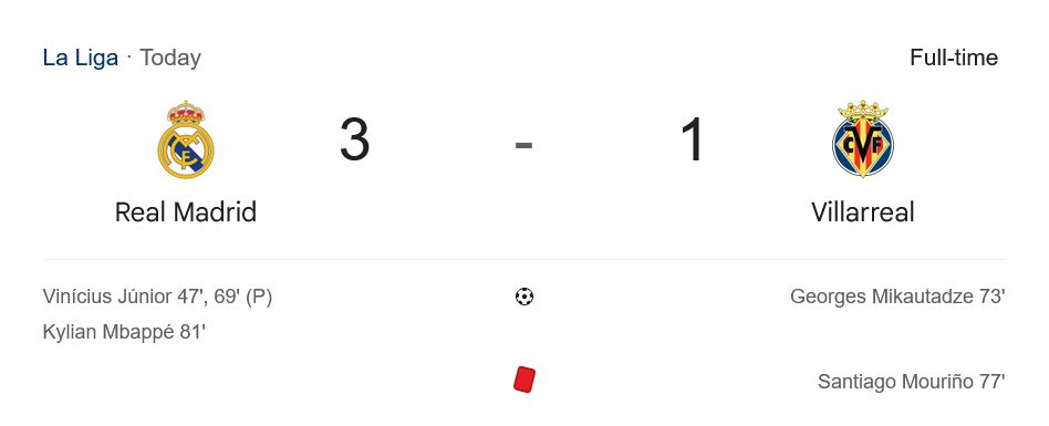 เกมเปลี่ยนทันทีหลังพักเบรก นาทีที่ 47 คีเลียน เอ็มบัปเป้ จ่ายทะลุช่องให้ วินิซิอุส จูเนียร์ หลุดไปยิงไม่พลาด ส่งเจ้าบ้านนำ 1-0 ก่อนที่นาที 69 “วินิซิอุส” จะมายิงจุดโทษอย่างเฉียบขาดเป็น 2-0 แต่ทีมเยือนไม่ยอมง่ายๆ นาที 73 จอร์จส์ มิเคาตัดเซ่ ยิงตีไข่แตกเป็น 2-1 ทว่าความหวังของบียาร์เรอัลต้องพังทลายเมื่อ ซานติอาโก มูริโญ่ โดนใบเหลืองที่สองเป็นใบแดง นาที 77 และในนาที 81 เอ็มบัปเป้ มาซัดปิดกล่องให้ เรอัล มาดริด เก็บชัยชนะ 3-1 อย่างเด็ดขาด