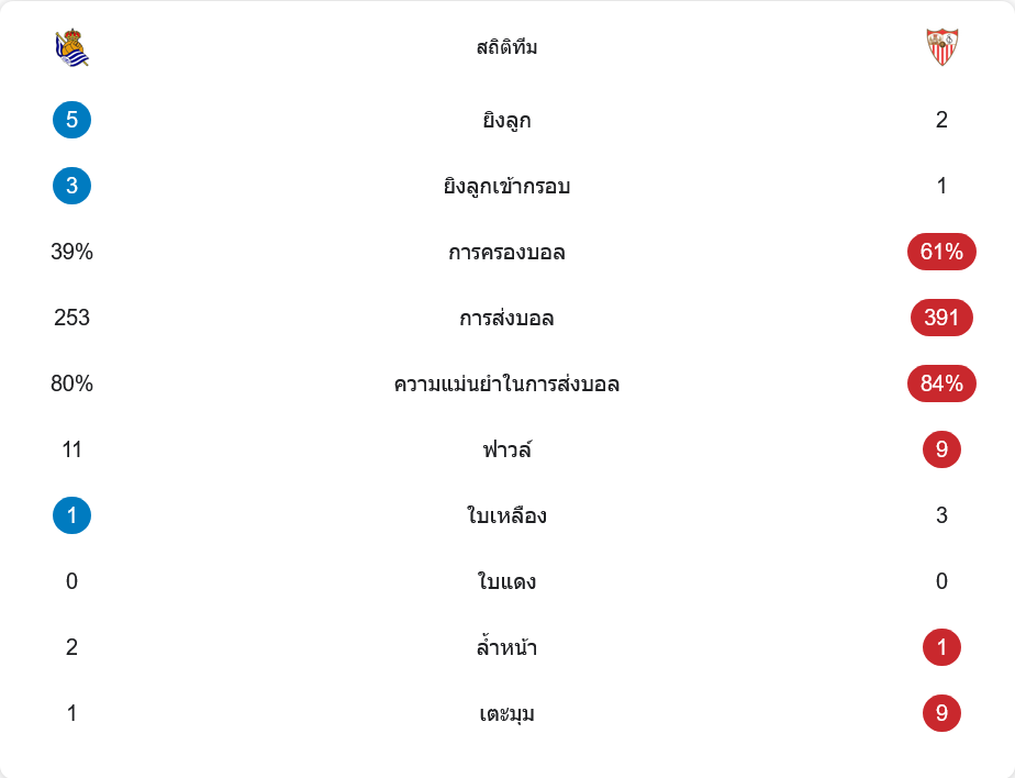 แม้เซบีย่าจะมีเปอร์เซ็นต์การครองบอลมากถึง 61% เทียบกับ 39% ของเจ้าถิ่น แต่จำนวนการยิงของโซเซียดาดชัดเจนและอันตรายมากกว่า โดยยิงทั้งหมด 5 ครั้ง เข้ากรอบ 3 ครั้ง ส่วนเซบีย่ายิงเพียง 2 ครั้งเข้ากรอบ 1 โซเซียดาดส่งบอลสำเร็จ 253 ครั้ง (80%) ขณะที่ เซบีย่า สูงถึง 391 ครั้ง (84%) ฟาวล์รวม 20 ครั้ง ใบเหลืองเจ้าถิ่น 1 ใบ ทีมเยือน 3 ใบ และลูกเตะมุมที่เซบีย่าได้มากถึง 9 ครั้ง