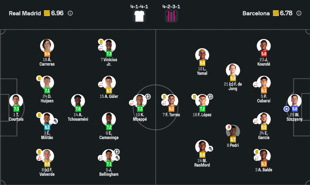 เกมนี้เป็นการปะทะกันของสองระบบที่คุ้นเคย วิเคราะห์บอล ได้ว่า เรอัล มาดริด ใช้แผน 4-1-4-1 เน้นการสวนกลับเร็วและการเจาะตรงกลางผ่านคู่หู เอ็มบัปเป้–เบลลิงแฮม ที่เข้ากันได้ดี ส่วนบาร์เซโลน่าในระบบ 4-2-3-1 พยายามครองบอลและคอนโทรลจังหวะ โดยมีเดอ ยองเป็นศูนย์กลางของเกม