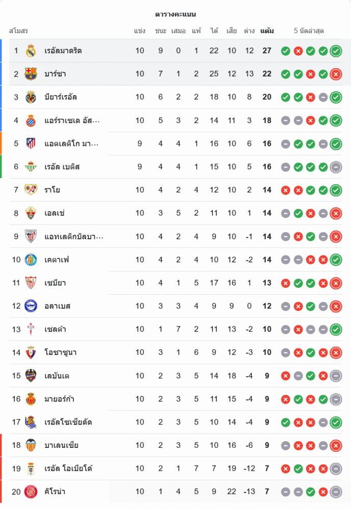 อันดับ 3 เป็นบียาร์เรอัล 20 คะแนน ส่วนแอต. มาดริดไล่ตามอยู่ที่ 18 แต้ม ทำให้การลุ้นแชมป์ฤดูกาลนี้ยังเข้มข้นสุด ๆ