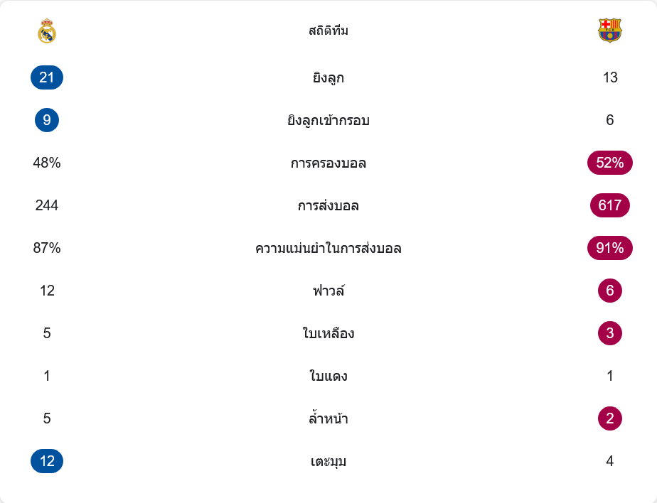 เรอัล มาดริดมีโอกาสยิงมากถึง 21 ครั้ง เข้ากรอบ 9 ครั้ง ขณะที่บาร์เซโลนายิง 13 ครั้ง เข้ากรอบ 6 ครั้ง ทีมเยือนครองบอล 52% สูงกว่าเจ้าบ้านที่มี 48% แต่การส่งบอลของมาดริดมีประสิทธิภาพในพื้นที่สุดท้ายมากกว่า โดยบาร์ซ่าส่งบอล 617 ครั้ง ความแม่นยำ 91% ส่วนมาดริด 244 ครั้ง แม่นยำ 87% เกมนี้ทั้งสองทีมได้ลูกเตะมุมต่างกันชัดเจน มาดริดได้ถึง 12 ครั้ง ส่วนบาร์ซ่าแค่ 4 ครั้ง