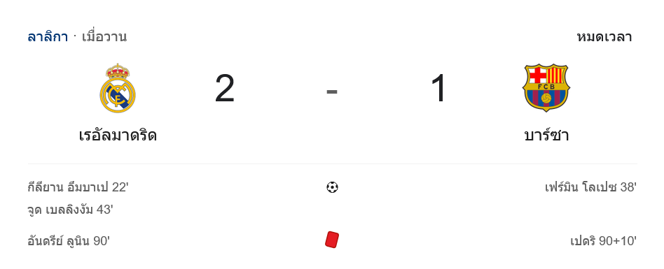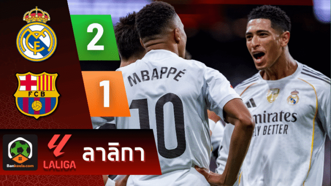 เกมเอลกลาซิโก้สุดเดือดที่ซานติอาโก้ เบร์นาเบว เรอัล มาดริดเปิดบ้านรับบาร์เซโลน่า และนี่คือหนึ่งในแมตช์ที่เดือดตั้งแต่ต้นจนจบ ผลบอลสด ออกมาด้วยสกอร์ 2-1 โดยเจ้าถิ่นอาศัยจังหวะจบสกอร์ที่เฉียบคมกว่าคู่แข่ง นาทีที่ 22 คีเลียน เอ็มบัปเป้ แทงทะลุช่องอย่างเฉียบ ให้ จู๊ด เบลลิงแฮม ซัดประตูขึ้นนำ 1-0 ต่อหน้ากองเชียร์ที่ระเบิดเสียงเฮสนั่นสนาม