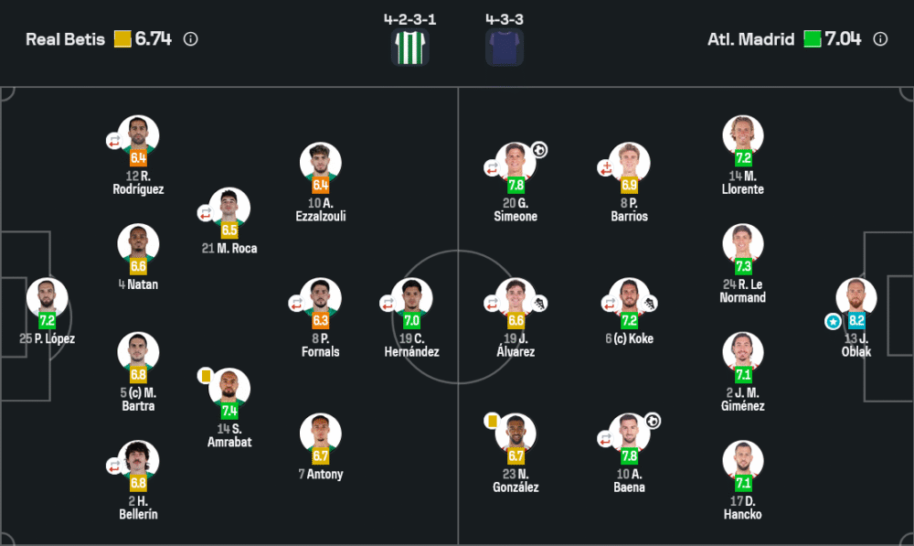 Oblak (8.2) — Hancko (7.1), Giménez (7.1), Le Normand (7.3), Baena (7.8) — Koke (7.2), J. Álvarez (6.6), Barrios (6.9) — Llorente (7.2), Simeone (7.8), González (6.7)