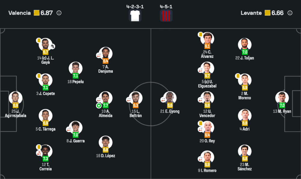 ในมุมมองของ บ้านกีฬา แผน 4-2-3-1 ของบาเลนเซียทำงานได้ดีเกือบทั้งเกม เกมรับวางไลน์ชัดเปลี่ยนเป็น 4-4-2 เวลาไล่เพรส ทำให้เลบานเต้ออกบอลจากแดนหลังลำบาก คู่เซ็นเตอร์อย่าง โกเปเต้ กับ ตาร์เรก้า เล่นแบบรัดกุม ไม่หลุดตำแหน่ง และมี กอร์เรอา ช่วยสกรีนทางขวา ทำให้ทีมเยือนไม่แทบได้จบจากฝั่งนั้นเลย