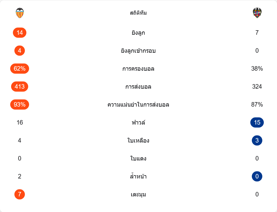 ตัวเลขหลังเกมยืนยันภาพบนสนามแบบตรงเป๊ะ บาเลนเซียยิงรวม 14 ครั้ง เข้ากรอบ 4 ขณะที่เลบานเต้ยิงได้เพียง 7 ครั้งแต่ไม่มีสักลูกที่ตรงกรอบ การครองบอลเจ้าบ้านขยี้ไป 62% ต่อ 38% ส่งบอลมากกว่า 413 ต่อ 324 ครั้ง และมีความแม่นยำในการส่งบอลสูงถึง 93% เทียบกับ 87% ของทีมเยือน
