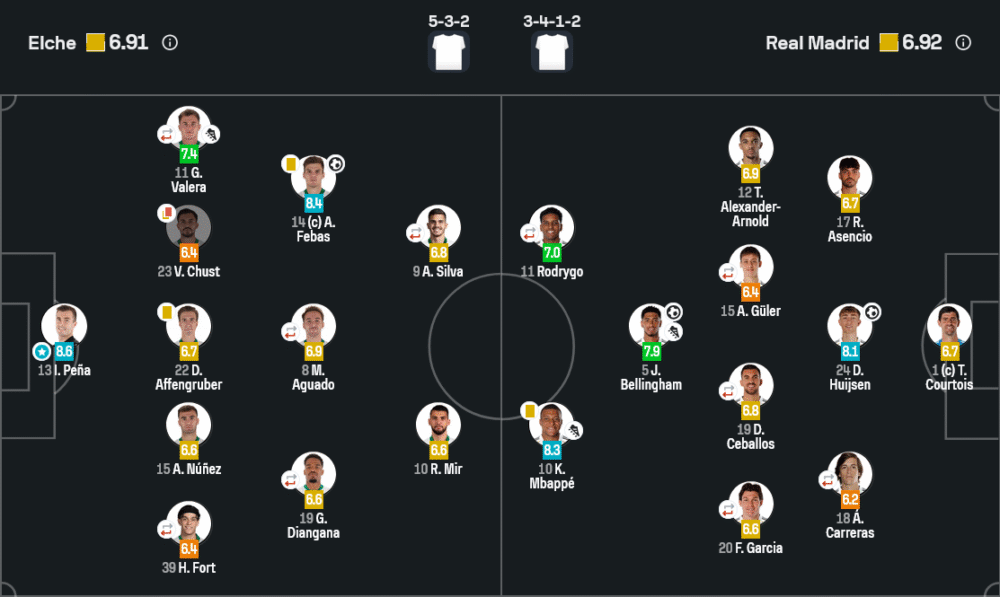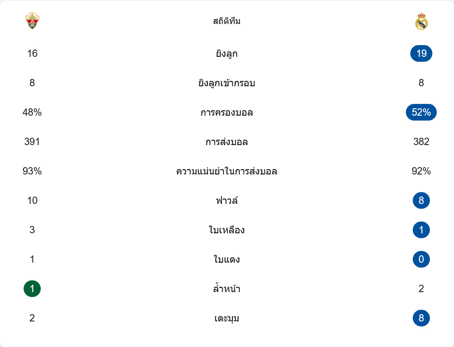 ตัวเลขหลังเกมสะท้อนว่าเกมนี้สูสีอย่างแท้จริง เอลเช่ยิงทั้งหมด 16 ครั้ง เข้ากรอบ 8 ครั้ง ขณะที่ เรอัล มาดริด ยิงมากกว่าเล็กน้อย 19 ครั้ง เข้ากรอบเท่ากัน 8 ครั้ง การครองบอลฝั่งราชันเหนือกว่าบางๆ ที่ 52% ต่อ 48% แต่จำนวนการส่งบอลกลับใกล้เคียง 382 ต่อ 391 แสดงให้เห็นว่าเจ้าบ้านก็สามารถครองบอลเล่นกับคู่แข่งระดับท็อปได้