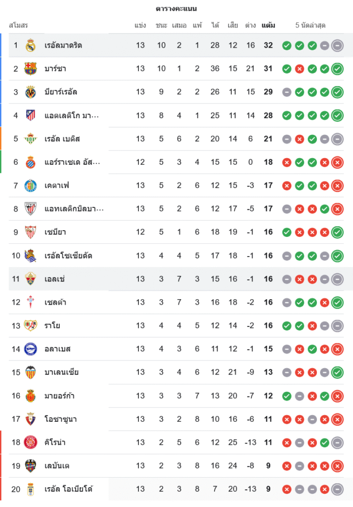 ผลเสมอเกมนี้ทำให้ เรอัล มาดริด เก็บเพิ่มเป็น 32 คะแนนจาก 13 นัด สถิติชนะ 10 เสมอ 2 แพ้ 1 ยังยึดตำแหน่งจ่าฝูงเหนือลิเวอร์พูล เอ้ย…บาร์เซโลนา (31 แต้ม) แบบเฉียดๆ แต่การสะดุดแบ่งแต้มกับทีมกลางตารางอย่างเอลเช่ ก็ทำให้ช่องว่างไม่ขยับหนีใครได้เลย ต้องลุ้นกันยาวๆ ในโปรแกรมโค้งต่อไป