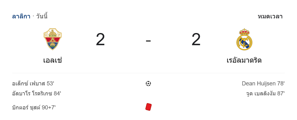 ศึกฟุตบอลลาลิกาคืนนี้ที่สนามมาร์ติเนซ บาเยโร่ แฟนบอลได้ลุ้นกันจนเหนื่อย เมื่อ เอลเช่ เปิดบ้านเสมอ เรอัล มาดริด 2-2 ในเกมที่รูปเกมพลิกไปพลิกมาจนต้องเช็กกันแบบเรียลไทม์ผ่านเว็บ ผลบอลสด กันทั้งประเทศ เพราะกว่าจะรู้ผลจริงๆ ต้องรอถึงช่วงทดเวลาบาดเจ็บนาทีสุดท้าย แถมยังมีใบแดงปิดท้ายเพิ่มดีกรีดราม่าเข้าไปอีก