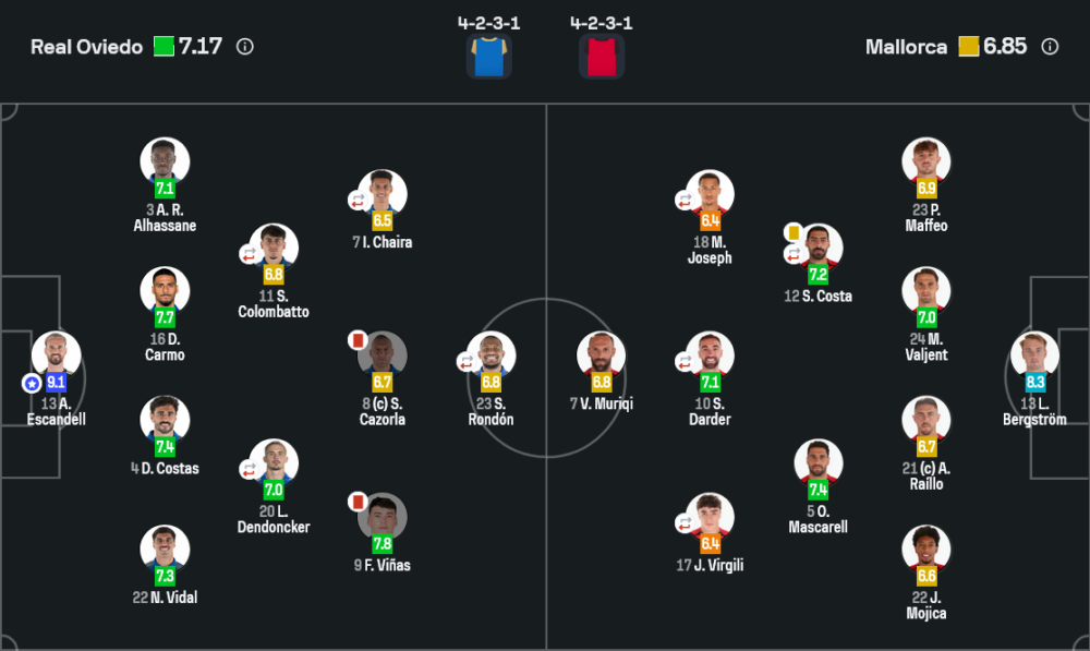 ตำแหน่งแมน ออฟ เดอะ แมตช์ ไม่มีใครคู่ควรไปกว่า อารอน เอสกันเดล นายทวารเรอัล โอเบียโด ที่ได้คะแนนสูงถึง 9.1 จากผลงานเซฟจังหวะสำคัญหลายครั้ง ทั้งลูกยิงไกลของ มูริกิ และจังหวะหลุดเดี่ยวช่วงท้ายเกม เขาควบคุมพื้นที่ในกรอบเขตโทษได้อย่างยอดเยี่ยม ออกมาตัดบอลโด่งไม่พลาดแม้แต่นิดเดียว