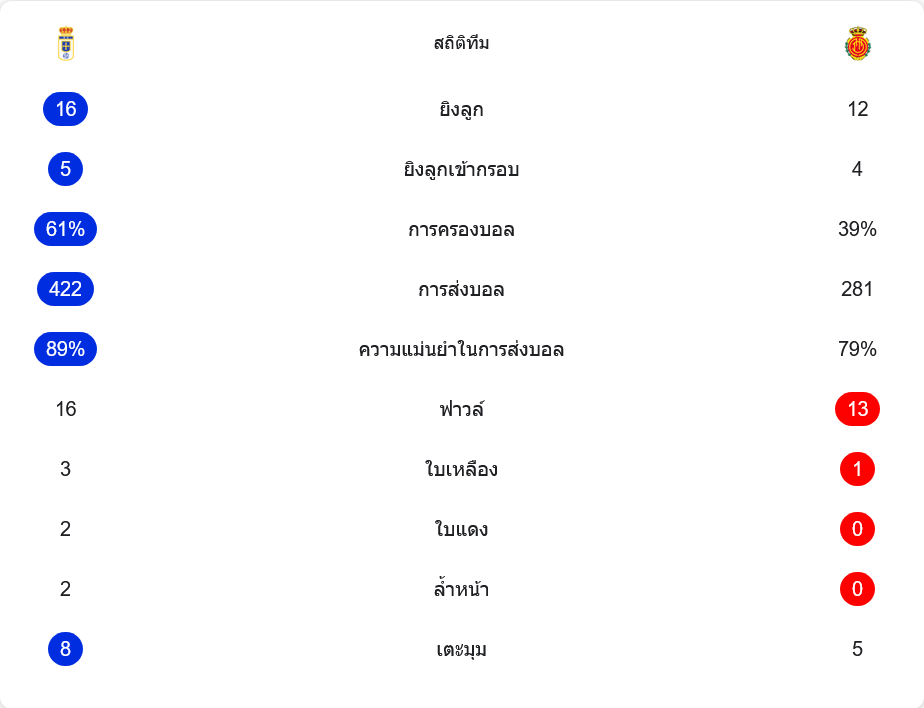 ตัวเลขหลังเกมสะท้อนภาพชัดเจนว่าโอเบียโดเป็นฝ่ายเดินเกมรุกมากกว่า เจ้าบ้านยิงทั้งหมด 16 ครั้ง เข้ากรอบ 5 ครั้ง ขณะที่มายอร์ก้ายิง 12 ครั้ง เข้ากรอบ 4 ครั้ง การครองบอลโอเบียโดเหนือกว่าชัด 61% ต่อ 39% แถมผ่านบอลได้มากถึง 422 ครั้ง ด้วยความแม่นยำสูงถึง 89% ขณะที่ทีมเยือนผ่านบอล 281 ครั้ง ความแม่นยำ 79%