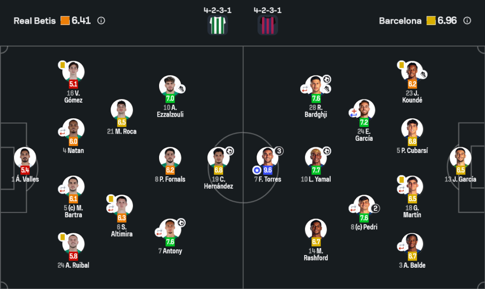 พระเอกของค่ำคืนนี้ยกให้ เฟร์รัน ตอร์เรส แบบไร้ข้อโต้แย้ง ซัดแฮตทริกตั้งแต่ครึ่งแรก ใช้เซนส์กองหน้าที่เฉียบคมทั้งการหาพื้นที่ว่าง การวิ่งตัดไลน์ และการจบสกอร์ที่นิ่งสนิท สร้างฝันร้ายให้แนวรับเบติสตลอด 70 กว่านาทีในสนาม นอกจากสามประตู เฟร์รันยังมีส่วนร่วมเชื่อมเกมกับแรชฟอร์ดและยามาลอย่างต่อเนื่อง ทำให้บาร์เซโลนาสามารถพักเลวานดอฟสกี้แล้วแนวรุกยังดุดันเหมือนเดิม เรตติ้ง 9.6 สะท้อนฟอร์มระดับโลกในค่ำคืนนี้ได้ชัดเจน