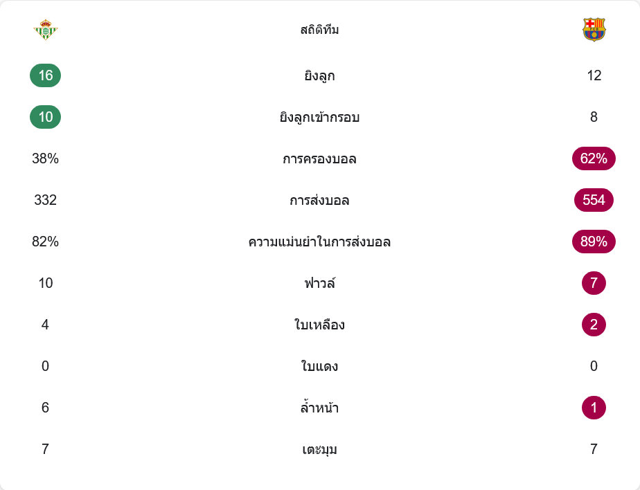 แม้เรอัล เบติสจะเล่นในบ้านและจบสกอร์ได้ถึง 3 ประตู แต่รูปเกมโดยรวมเป็นของบาร์เซโลนาอย่างชัดเจน เบติสยิงทั้งหมด 16 ครั้ง เข้ากรอบ 10 ครั้ง ขณะที่บาร์ซ่ายิงเพียง 12 ครั้งแต่เข้ากรอบถึง 8 ครั้ง แสดงให้เห็นว่าทีมเยือนใช้โอกาสได้คุ้มค่ากว่า การครองบอลอยู่ที่ 38% ต่อ 62% บาร์ซ่าเหนือกว่าด้วยจำนวนการผ่านบอล 554 ต่อ 332 และความแม่นยำในการผ่านบอล 89% ต่อ 82% การฟาวล์ใกล้เคียงกัน 10 ต่อ 7 แต่เบติสโดนใบเหลืองถึง 4 ใบ ขณะที่บาร์ซ่าโดน 2 ใบ เกมริมเส้นของเจ้าถิ่นยังสร้างโอกาสได้ดีจากลูกเตะมุม 7 ครั้งเท่ากับทีมเยือน และมีจังหวะล้ำหน้ามากถึง 6 ครั้งจากการดันไลน์สูงไล่ตีตื้นช่วงท้ายเกม